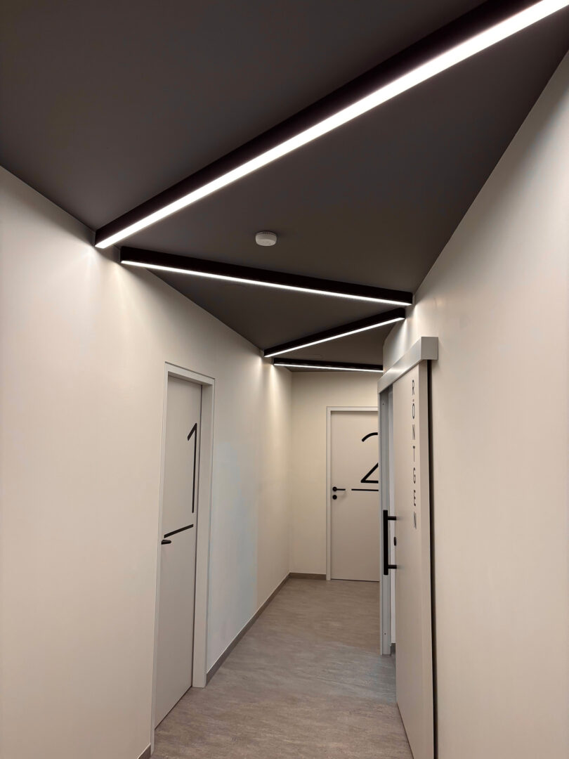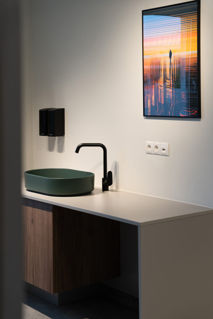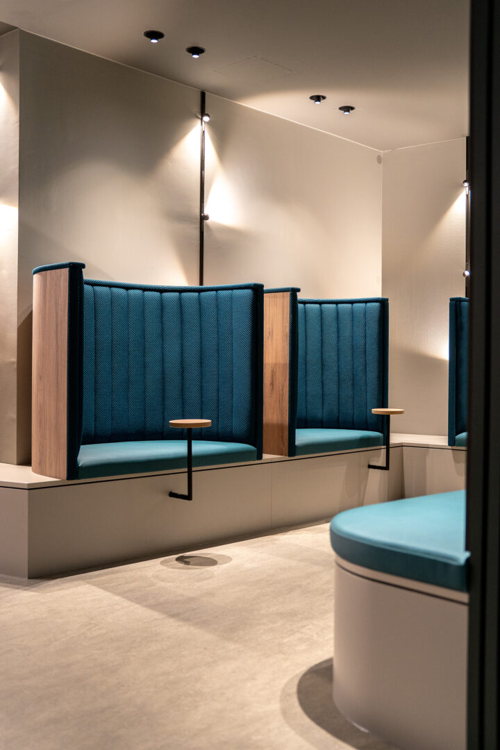 Formen und Materialien verleihen dieser Ordination eine moderne und zugleich einladende Atmosphäre. Die präzise Lichtführung unterstützt die Orientierung im Raum, nimmt optische Härten und verstärkt das Gefühl von Weite und Wohlfühlcharakter. Der Wartebereich besteht aus Sitzkojen mit Vinyl-Stoffen und Holzverkleidungen. Wandakustik-Paneele sorgen für eine ruhige Wartezimmer-Stimmung.