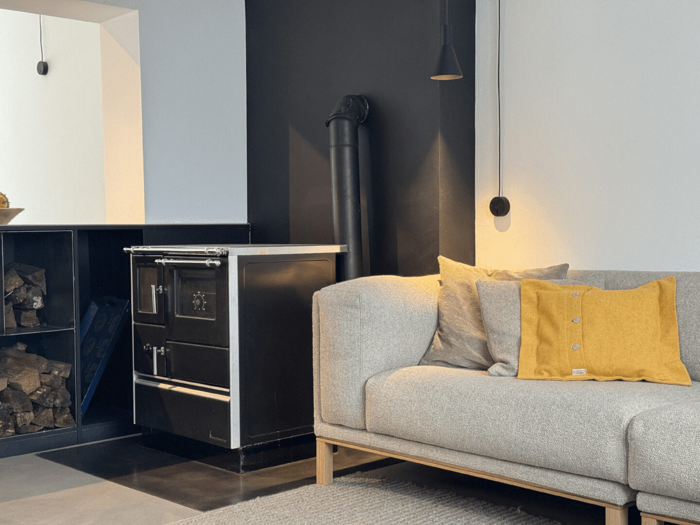 Wohnungsprojekt von fineconnect, Couch daneben ein Holzofen, pure Gemütlichkeit, Landhaus-Vibes