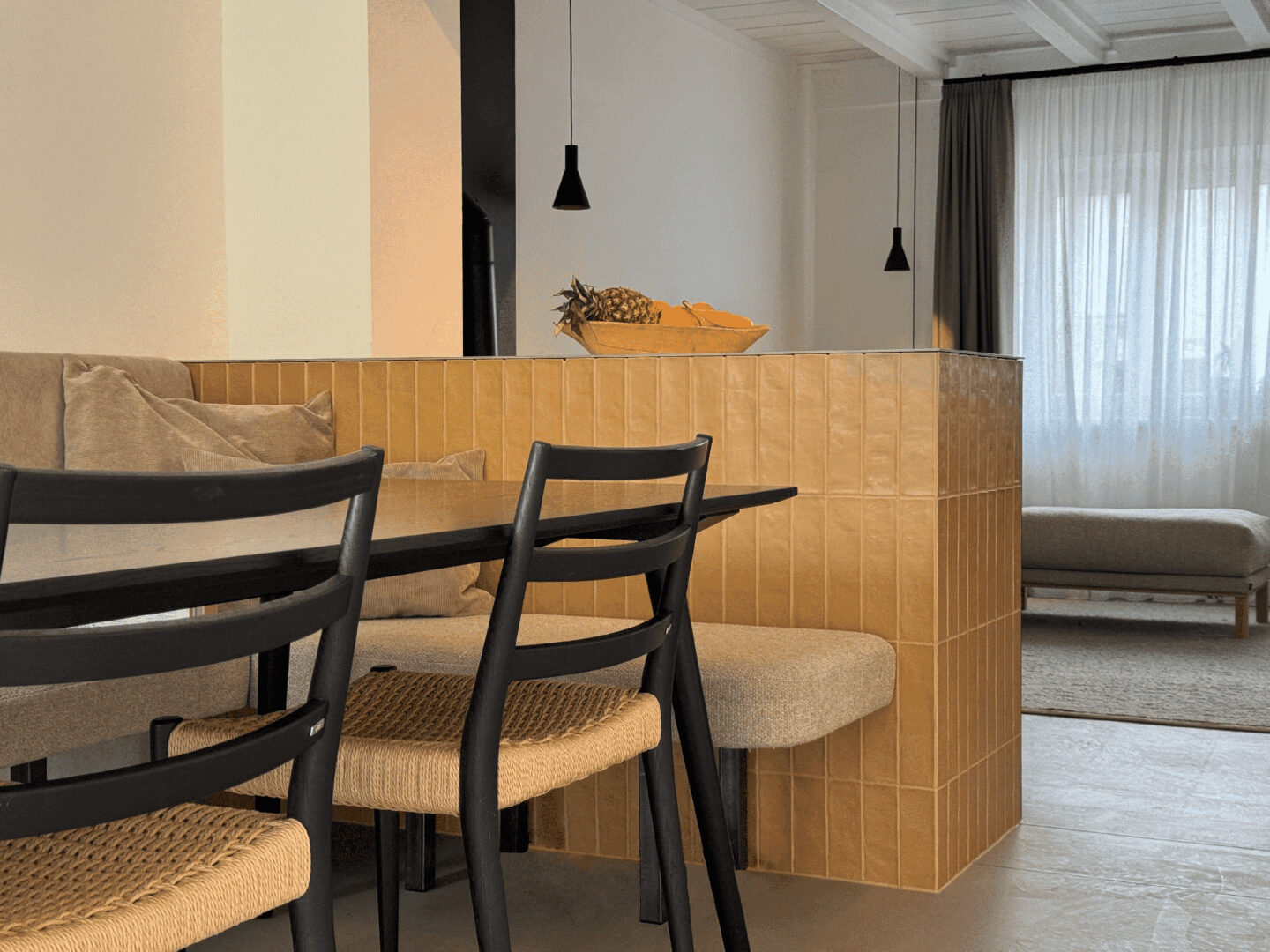 Als farblicher Akzent zieht sich ein leuchtendes Senfgelb durch das Haus. Gemütlich zeigt sich im Essbereich das mit senfgelben Fliesen verkleidete Möbel. Diese farbige Fläche bringt Wärme und Lebendigkeit in das Gesamtbild und findet sich auch in ausgewählten Details der Einrichtung wieder, was dem Interieur ein stimmiges, harmonisches Konzept verleiht.
