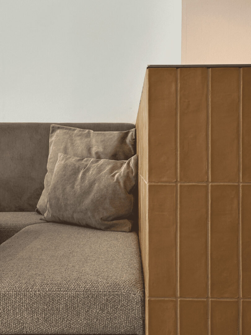 Wohnungsprojekt Detailfoto, senfgelbe Fliesen und Couch Ecke