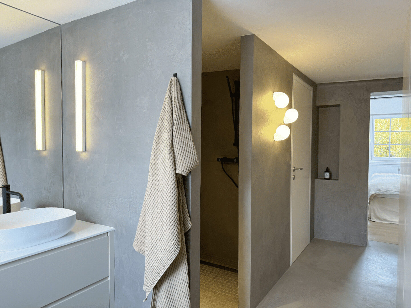 Die Bäder wurden in Wellnessoasen umgewandelt. Spachtelboden und gespachtelte Wände laden zum Relaxen ein. Wandleuchten, perfekt positioniert, sorgen für die richtige Stimmung. Hier spielen kleine Details eine große Rolle.