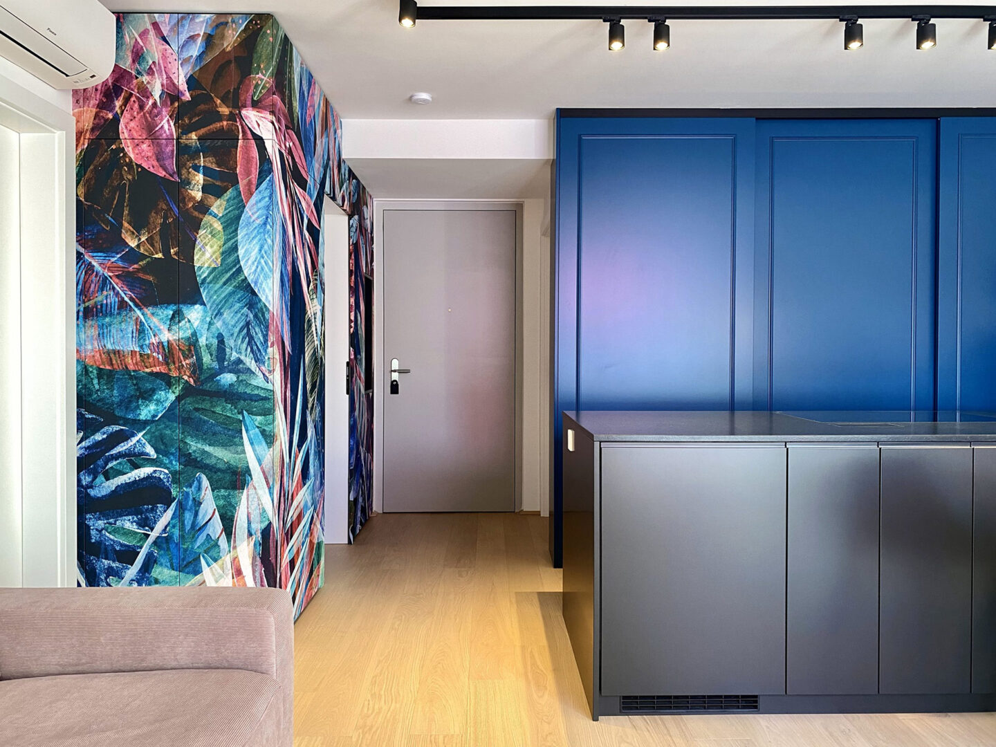 Ein besonderes Highlight ist der Wand-Verbau mit der fast nicht erkennbaren Tapetentüre, die ins Familienbad führt. Das Muster der farbenfrohen Tapete wirkt harmonisch mit den Blautönen der Küche, bringt Lebendigkeit und Individualität in den Raum und verleiht dem Loft einen unverwechselbaren Charakter.