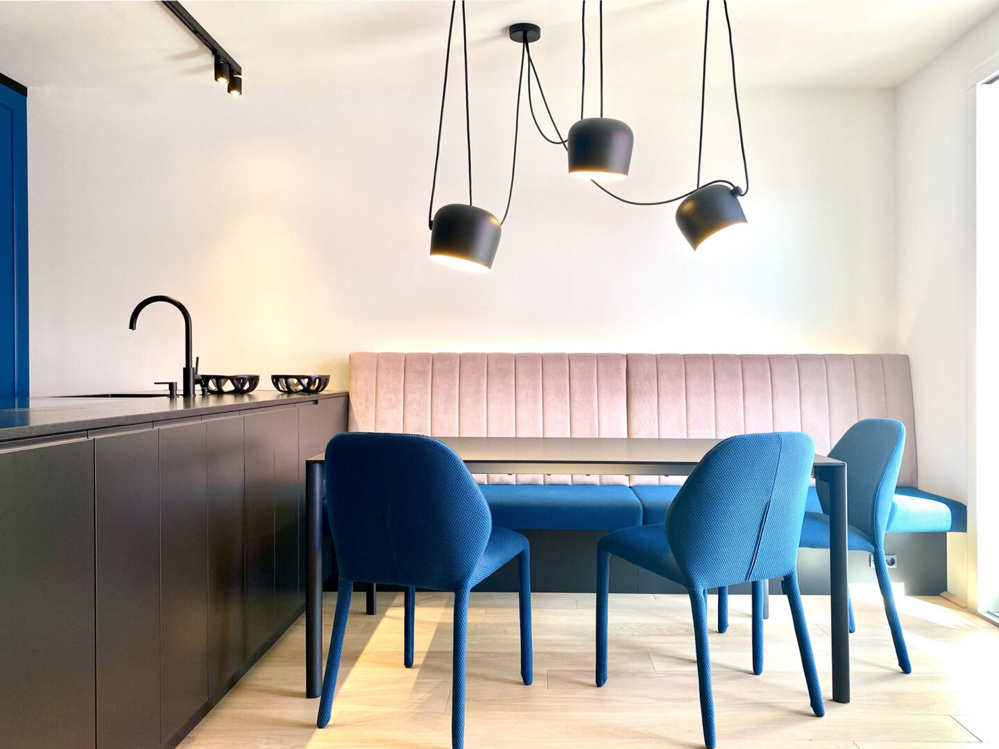 Diese moderne Loft-Wohnung beeindruckt durch ihr kreatives Farbkonzept und den spannenden Mix aus Materialien und Strukturen. Der offene Wohnraum ist von kräftigen Blautönen geprägt, die dem Raum eine elegante Atmosphäre verleihen. Besonders die Schiebewand in sattem Blau, welche die Küchenzeile versteckt, setzt ein starkes gestalterisches Statement und bildet zusammen mit der schwarzen Kücheninsel einen markanten Kontrast.