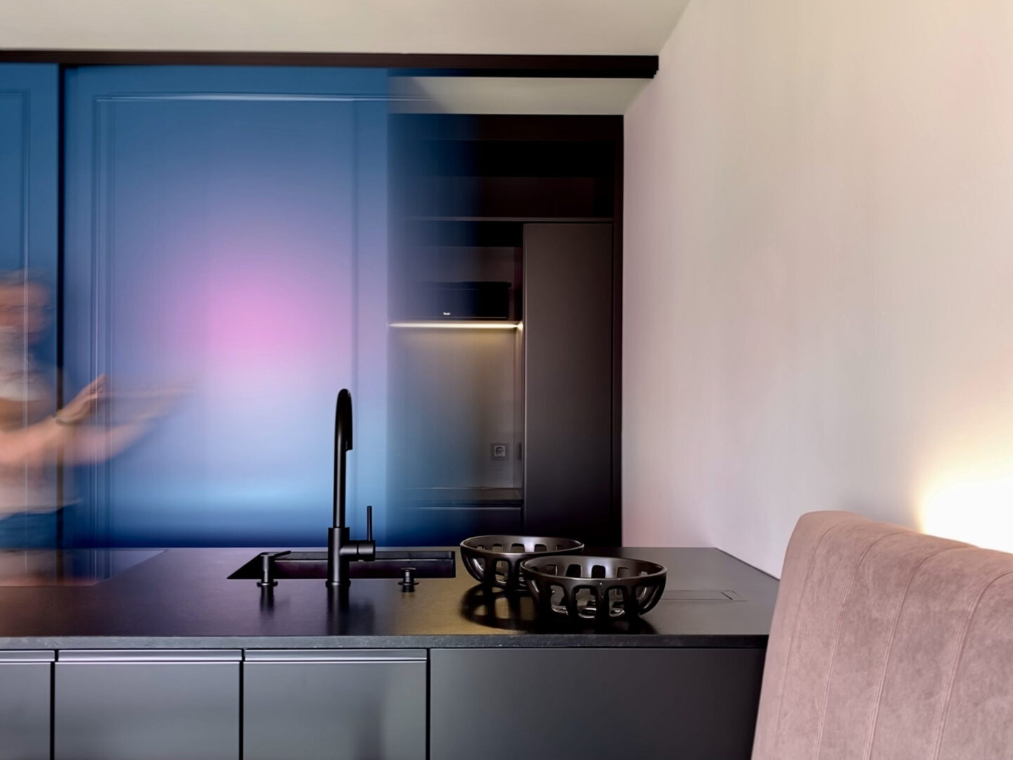 Das Zusammenspiel von kräftigen Farben, klaren Linien und spannenden Oberflächen schafft eine moderne, kreative Wohnatmosphäre. Ein Ort, der Design und Persönlichkeit auf einzigartige Weise verbindet.