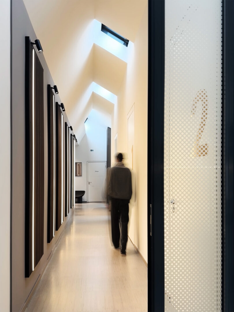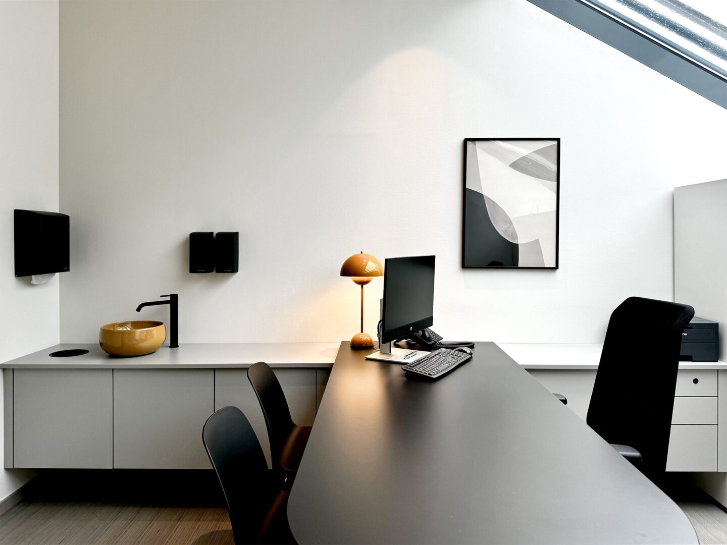 In einer Dachgeschossimmobilie unweit vom Westbahnhof entfernt, wurde eine Atmosphäre für Patienten geschaffen, in der Holzoberflächen, klare Linien und ruhige Farben zum Ankommen einladen.